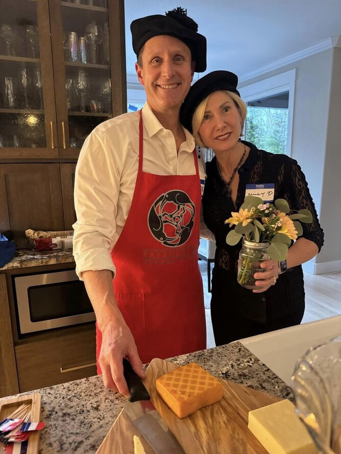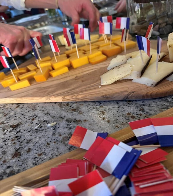 The dinner was held in the lovely home of one of our teammates with the host and hostess looking very chic in their berets. The atmosphere was quite French with swags of the French triclore on the windows and blue, white, and red napkins and plates in addition to miniature French flags adorning many of the foods.