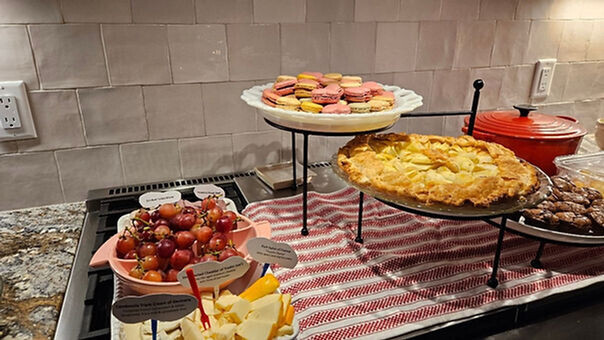 This delicious repas was followed by an array of tempting desserts attractively displayed on tiered plates. There were colorful macarons, petite chocolate cakes, and a tart apple galette. All of this socializing was followed by a lively discussion of the upcoming regatta in France and the next two plus years leading up to it.