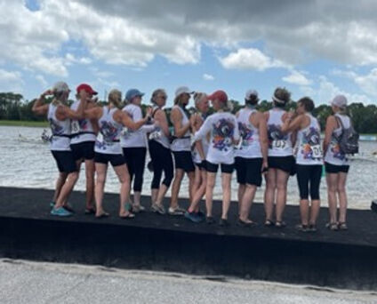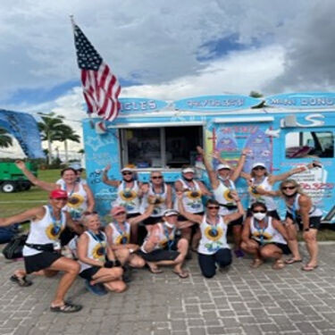 The Sisters even went one step further. They connected their flower choices with what it symbolized and how they felt it connected us on the team. They talked about energy and beauty; strength and fragility; individuals and team; exuberance and determination; stamina and resiliency; love and support. The result was that we felt like we had created the most phenomenal bouquet. It was a bouquet of life —one that represented us and connected us. We decided to turn the flowers into a special shirt. The Dragonheart VT Sisters raced in these sunflower shirts at the 2022 CCWC and again at the 2023 CCNC in Sarasota, Florida. There has been so much interest in our shirts that we have been selling them as a team fundraiser. Clearly, there are just so many ways that Eugenie’s idea has kept growing.