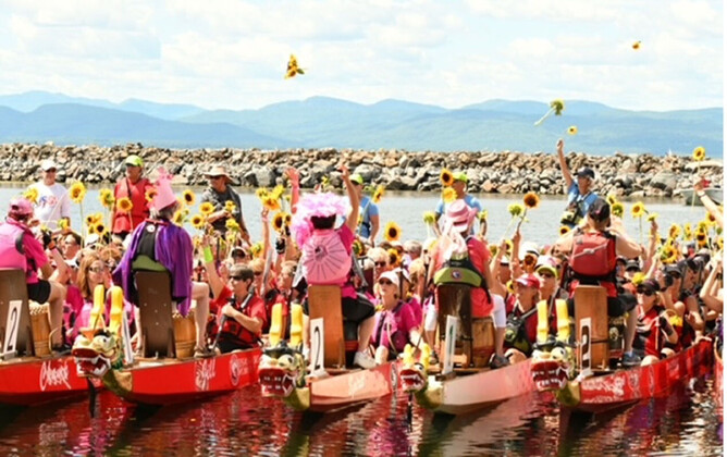 It all began very organically years ago. Our Dragonheart Vermont club annually hosts the Lake Champlain Dragon Boat Festival on the first weekend of August. It is an all-hands-on-deck event, and every member is asked to pitch in to ensure its success. A teammate named Eugenie is an organic farmer and offered to grow the flowers for our beloved Flower Ceremony. She suggested sunflowers —for their beauty and resiliency and how they turn to face the sun. When the buckets of sunflowers arrived on Festival Day, we were in awe of the sunflowers’ majesty. It was as if the day was sunnier, and the sky was bluer. Smiles were everywhere. The sunflowers truly made our Flower Ceremony so cheery, so meaningful. We breast cancer survivors felt it enhanced our feelings of love and connection especially knowing that Eugenie had nurtured these flowers from seeds. There was no science behind these feelings, it was just all from the heart.