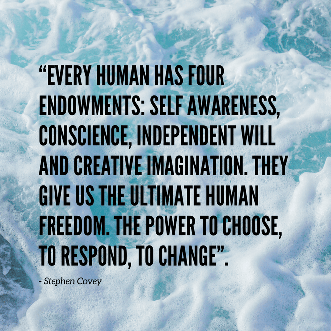 “Every human has four endowments: Self Awareness, Conscience, Independent Will and Creative Imagination. They give us the ultimate human freedom. The power to choose, to respond, to change”.
