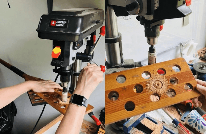 6. Wow, it didn’t take long to figure out that using a regular paddle wasn’t going to work well. Every stroke was a challenge. I grabbed an old damaged wooden paddle and started making some modifications. I kept adding more holes to make the paddling feel more similar to paddling in a real boat.
