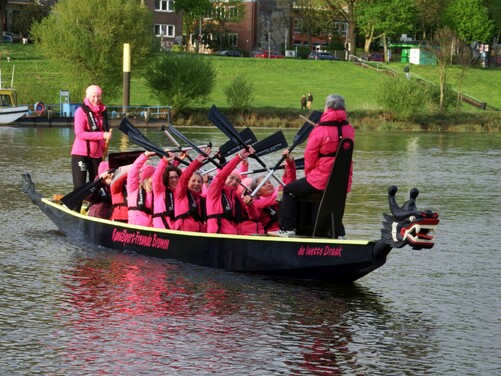 Two of us just learned the position of the helmswomen in the dragon boat last season. Friendly dragonboat clubs have guided us. Ladies try it! It’s worth it. Now we control and train ourselves. What an honour and what an adventure.