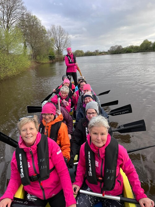 The football stadium, “Weser-Stadion“, is our paddling territory, you can see it on one the photos. 14 pink dressed beauties in wind and weather (12C, rain, windy) started the 2024 season. What a great feeling for all of us!!