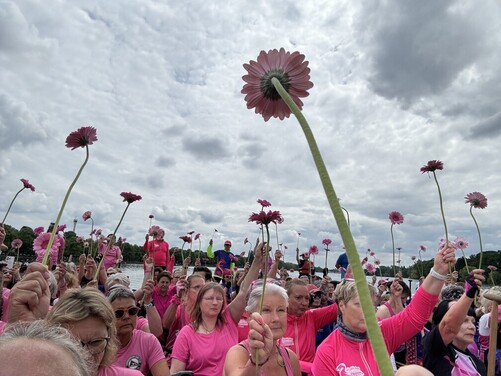 The flower ceremony on Saturday was the most emotional moment. Twelve boats filled with pink paddlers floated near the shoreline while Germany´s oldest female hard rock band Rosy Vista played a song of remembrance for the paddlers in the boats, for those watching from heaven and for the many spectators. “Dragonboating is a way for us to take back our lives, to remind ourselves that we are strong and to find solace on the water.“ The lake was soon covered in pink flowers to remember our sisters and brothers who lost their lives to breast cancer.