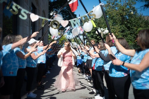On Saturday, September 20, 2025, in downtown Ottawa, 25 members of the Busting Out Ottawa Dragon Boat Club gathered outside the Lord Elgin hotel to create a stunning paddle arch in celebration of teammate Nikki Bedard’s wedding at the National Arts Centre across the street.