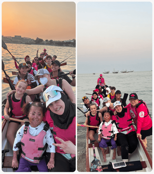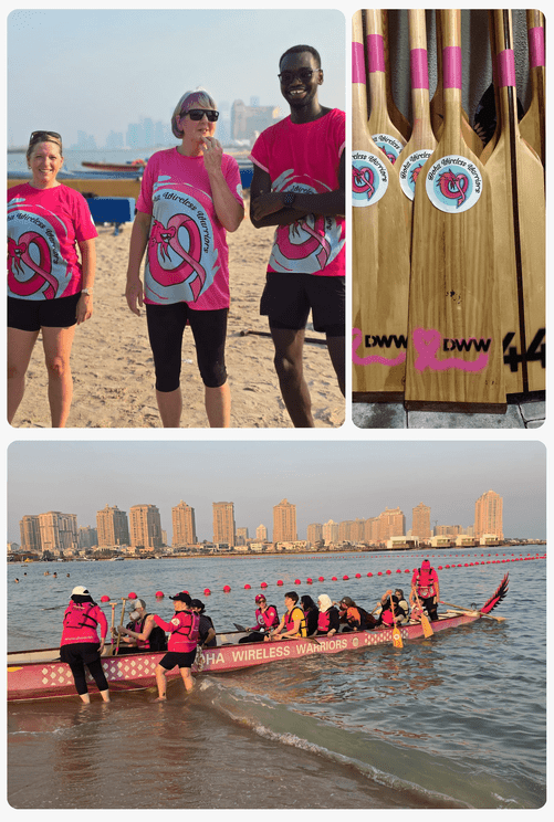 The Doha Wireless Warriors started 12 years ago in Doha, Qatar after its founder, Sandee Thompson, was recovering from a bilateral mastectomy for a recurrence of breast cancer. What started as a once weekly paddle of survivors and supporters in a rented boat soon turned into three and sometimes seven days a week worth of sessions in our own two boats… Accidentally…. inadvertently….we’ve become a force to be reckoned with in our community. We do a lot of awareness-building workshops and this year, we are given permission to bring children to the beach to paddle! Building awareness that having cancer is not a death sentence is our main goal, all whilst having fun.